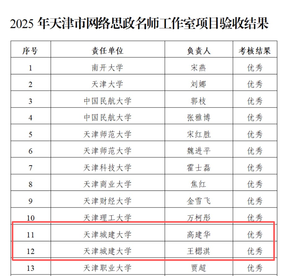 近日,天津市教育两委公布2025年天津市网络思政名师工作室项目验收结果,由我校高建华团队负责的天津城建大学网络思政名师工作室“城”不欺我的马老师、王楒淇团队负责的天津城建大学网络思政名师工作室“城”事儿双双获评优秀项目。