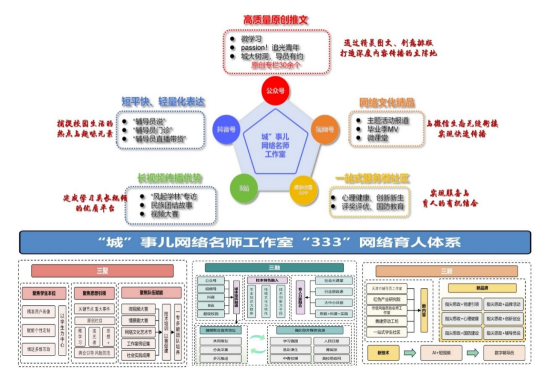 2025年,“城”事儿天津市网络思政名师工作室着力构建“三聚三融三新”网络育人模式,坚持“统一策划、创新模式、整合资源、强化队伍”的工作思路,建成“五位一体”媒体矩阵,创作展播一系列有感染力、影响力的公众号推文、短视频、微电影等优秀作品,既有“随手拍”又有“大制作”,推出毕业MV、《李诫穿越记》《同祖国共同成长》等短视频作品,发布学校首部AI赋能思政动画短片,将思政教育转化为可视化的轻量化表达,创新推出“辅导员说”“辅导员门诊”系列短视频专栏,围绕放假安全、防诈骗、学生理想信念教育进行网络思政教育。2023年立项至今,共发布短视频近200期,累计浏览量超500万次,粉丝量破6万,总获赞量超20万,获天津市高校思想政治工作精品项目、大中小思政课题立项,原创作品获教育部“读懂中国”最佳微视频、“津彩e路”大学生网络文化节二等奖等荣誉10余项,将天城大师生喜闻乐见的“城大好故事”、“城大好声音”传播得更广、更远,实现了粉丝量与影响力的双突破,有效推动思政工作入脑入心。