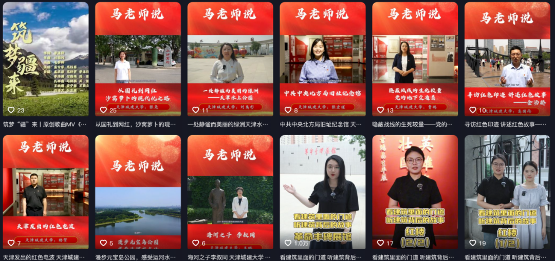 2025年,天津城建大学网络思政名师工作室“城”不欺我的马老师深度联动学校红色文化遗产研究院、革命丰碑展馆等平台,将天津市红色文化遗产、“人民城市”建设实践转化为可视化内容,在抖音平台“城”不欺我的马老师推出系列作品10期,此外,工作室继续推出“马老师说”系列微课作品8期,以“小切口”解读大主题,将专业知识与思政课深度融合。作为首批天津市网络思政名师工作室培育项目,该工作室自2023年成立以来,在学校党委高度重视和坚强领导下,坚持目标和效果导向,以思政课改革创新为出发点,持续深耕“思政+情怀+热点”创作模式,聚焦青年学生思想需求,推出系列精品内容。截至目前,该工作室抖音账号“城”不欺我的马老师共推出“马”老师的毕业寄语、红色文化解读等作品100余期,涵盖天津市红色建筑遗产保护、“人民城市”建设实践、新时代伟大变革等主题,其中《信仰的力量》等爆款作品,单条最高点赞量超1.1万。账号粉丝量突破9.9万,总获赞量超20万。